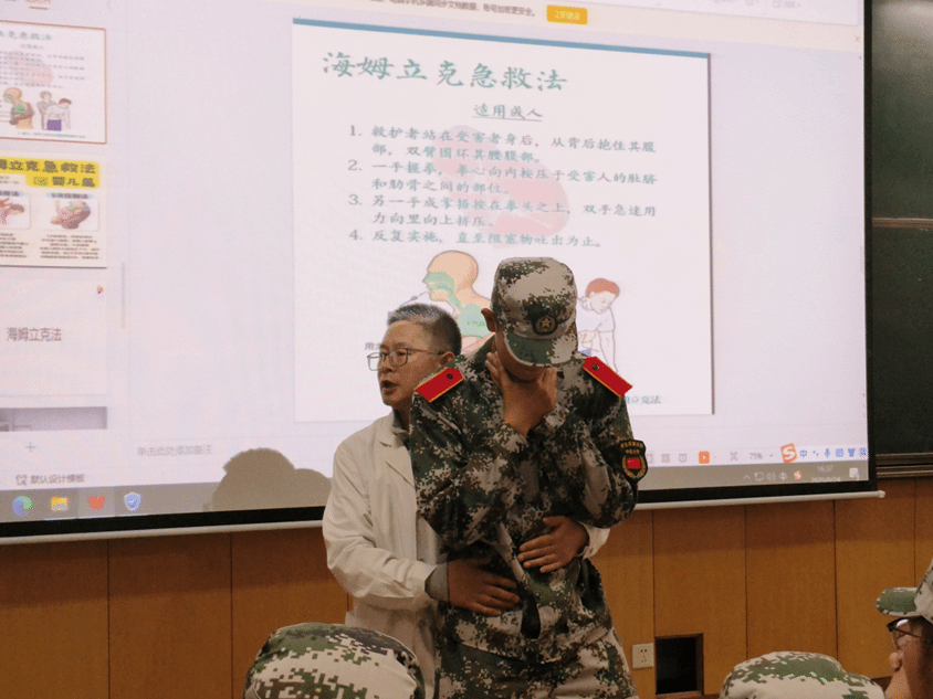 针对异物卡喉这一常见危险场景,校医院工作人员示范海姆立克急救法的站姿操作要领,还邀请同学上台模拟练习,及时纠正动作偏差。
