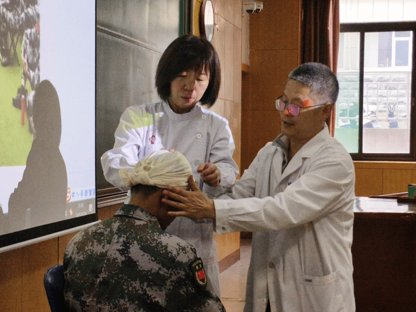 在包扎技能教学环节,校医院工作人员展示了头部、手臂等不同部位的包扎方法,讲解绷带、三角巾的正确使用技巧,确保师生能快速掌握基础止血、伤口保护的实用方法。