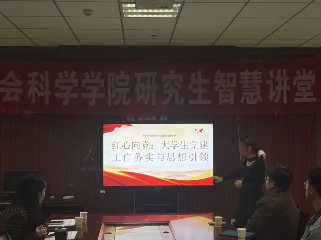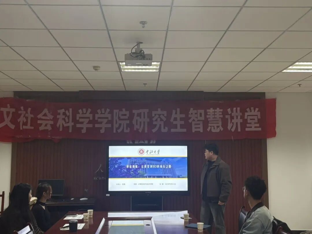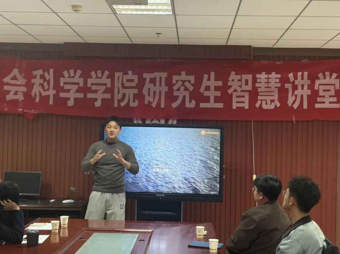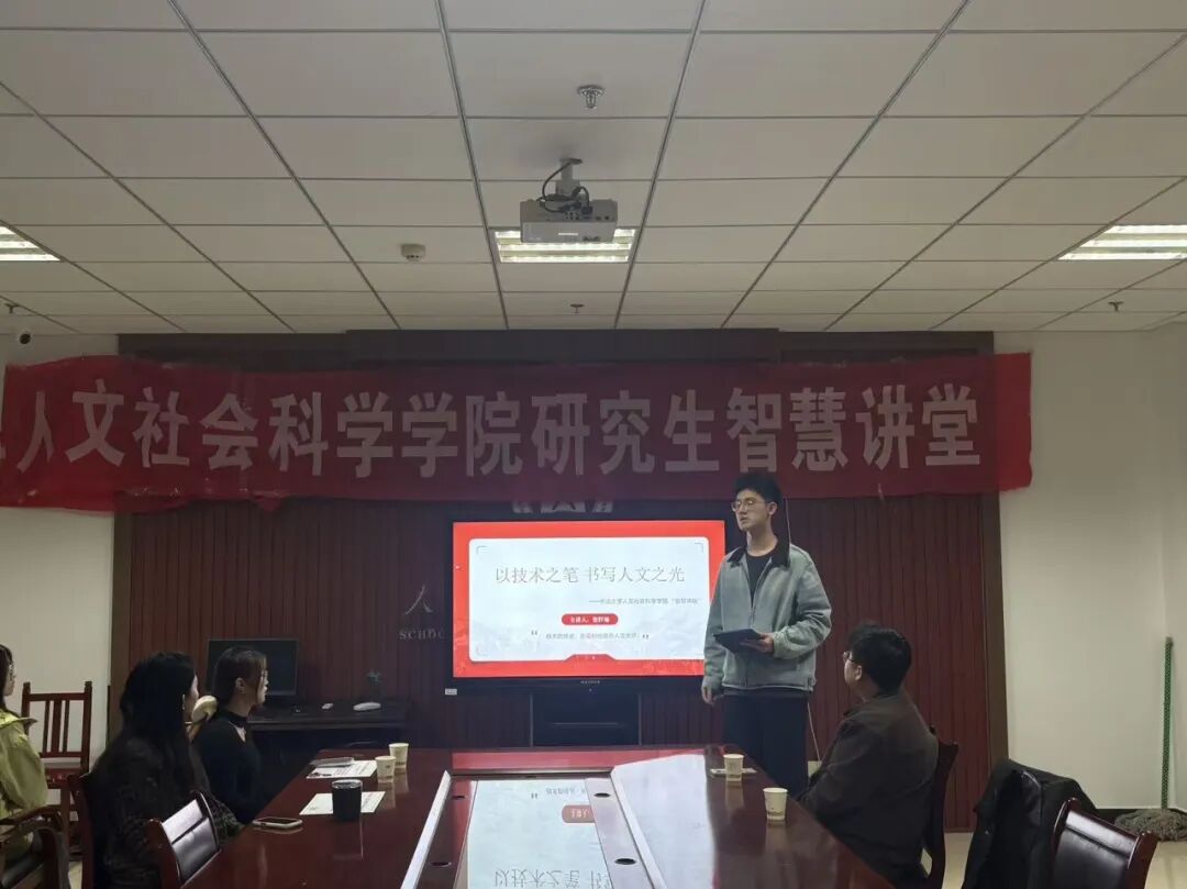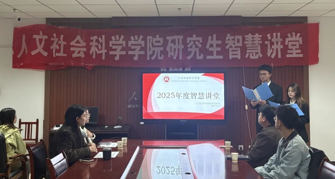10月22日晚,人文社会科学学院研究生智慧讲堂于院楼615教室举行。研究生会主席以及各部门部长、计算机科学与技术学院张轩瑜和赵康、人文社会科学学院靳荟怡和李彩月、体育学院裴悦颖和刘森以及2025级全体研究生参加了此次智慧讲堂。