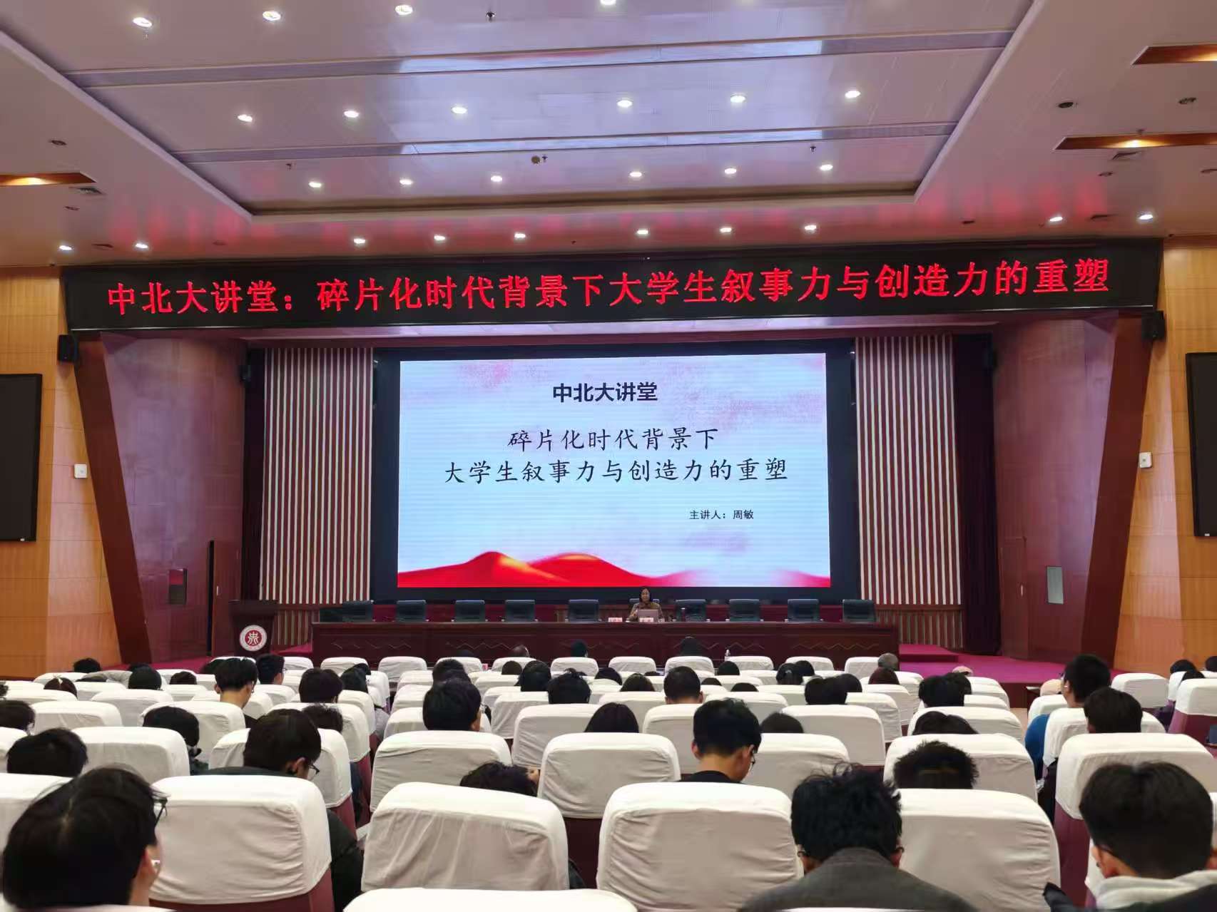 11月29日下午,由学生工作部(研究生工作部、武装部)主办、人文社会科学学院和仪器与电子学院承办的中北大讲堂在图书馆学术报告厅顺利举办。本次大讲堂特邀北京作家协会副主席、北京老舍文学院常务副院长、知名作家周敏女士主讲,以“碎片化时代背景下大学生叙事力与创造力的重塑”为主题,助力中北大学青年学子将碎片化体验转化为创新灵感的源泉,在学术探索、社会实践与文化创作中练就独立思考的硬本领,成长为既能精准表达自我、又能深刻洞察时代的复合型青年人才。