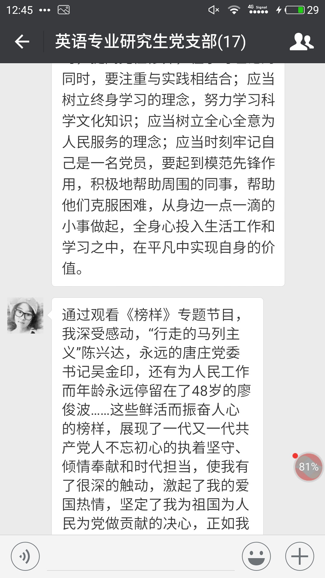 2017年10月11日,我院各党支部分别组织了《榜样》学习和交流活动。思政部教工党支部、政治学与行政学专业教工党支部通过组织党员集体观看专题节目进行学习,党员们学习后撰写了观后感和学习心得;公共英语教工党支部、专业英语教工党支部、英语专业研究生党支部、法学专业教工党支部全体党员在微信群里进行交流与学习,分享学习心得;广播电视学专业与汉语言文学专业教工党支部通过小组集体学习的形式,观看专题节目后进行热烈的讨论;学生第一党支部、学生第二党支部、思政专业研究生党支部按照要求进行自学并撰写和上交了学习心得。