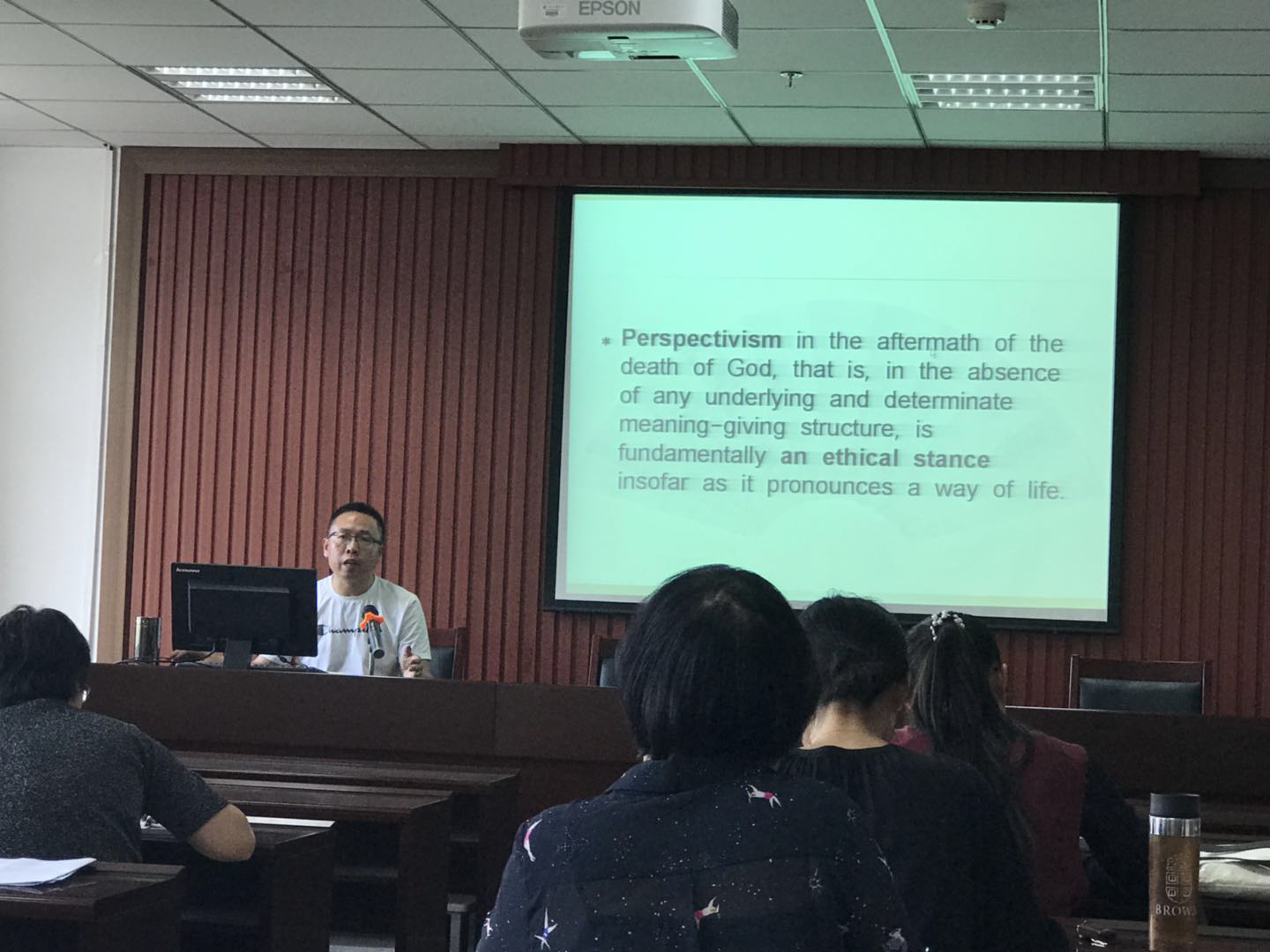 2018年6月5日,人文社会科学学院英语语言文学学科部开展第四次学术活动,学术活动由赵国锋老师主讲“乔伊斯的尼采之维”。赵老师从尼采的哲学思想入手,分析其哲学思想在现代主义意识流类小说旗手乔伊斯的作品中是如何体现的。赵老师首先谈到小说的任务,引用胡塞尔的观点说明小说的任务是引导人们回归人的本真追求,即精神追求。然后从尼采哲学的三个角度,即perspectives, becoming, autogenetics 来探讨乔伊斯的《都柏林人》,《尤利西斯》的写作风格、写作内容是如何反映后结构主义及解构主义阐释上的多元性、生命本真的偶然性、以及艺术家是如何通过作品成就自己的。活动在热烈的讨论中结束,并相约下次讨论的议题与方式。