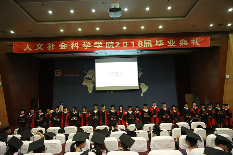 2018年6月25日下午,中北大学人文社会科学学院2018届毕业典礼在图书馆五层学术报告厅举行。院党委书记雷丽蓉、院长芮燕萍、党委副书记兼副院长王晓东、副院长杜刚、副院长杜鹃以及各学科部主任、副主任、辅导员和各毕业班班主任出席本次典礼。