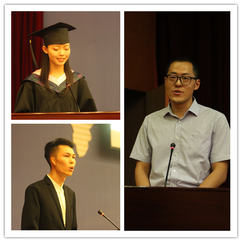 毕业生代表闫晓敏同学带领大家回忆了大学四年生活的点点滴滴;相逢是问候,离别是祝福,在校生代表刘思朗同学在发言中表达了对毕业学长学姐们的感谢与祝福;教师代表张玮麟老师在致辞中寄语毕业生:责任意味着能力,能力意味着权力,同学们一定要充满动力,努力让自己成为一名君子,追求卓越,止于至善。