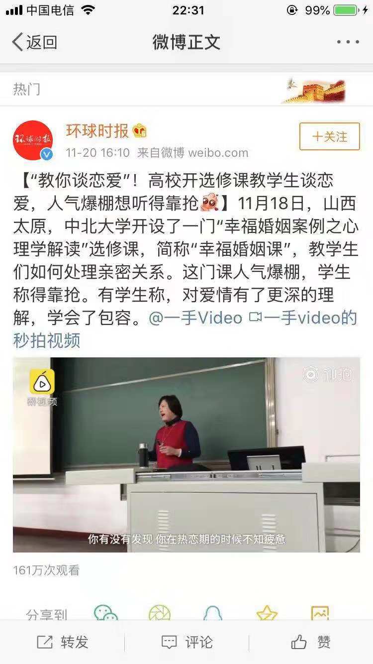 近日,网文“教你谈恋爱”!高校开选修课教学生谈恋爱,人气爆棚想听得靠抢”在网络热传,文章介绍了我校人文社会科学学院吕蕙老师开设的“幸福婚姻案例之心理学解读”选修课受到中北学子欢迎的情况。