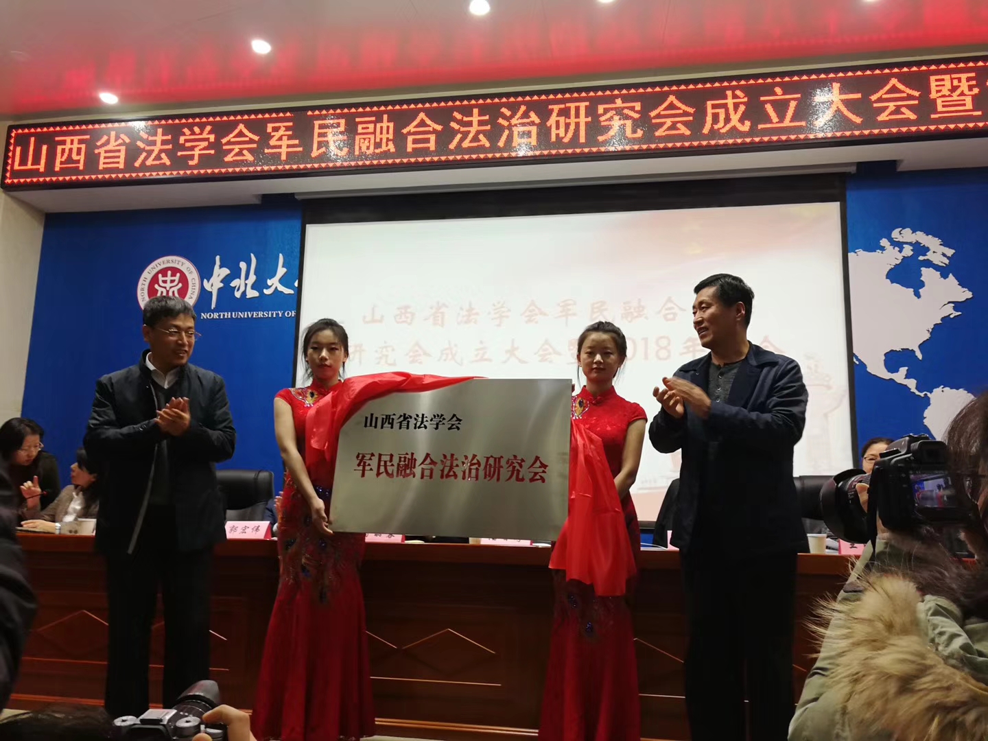 马俊副会长、潘晋孝副校长为“山西省法学会军民融合法治研究会”成立揭牌,并与参会代表进行合影留念。