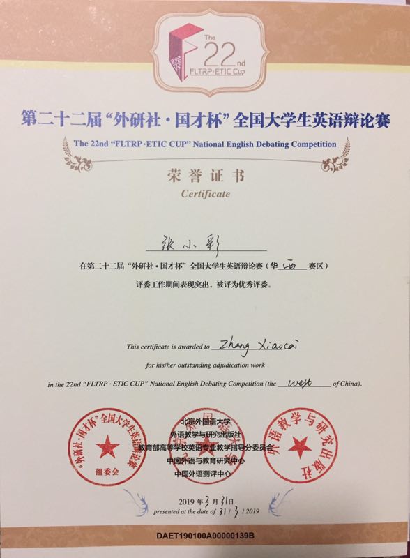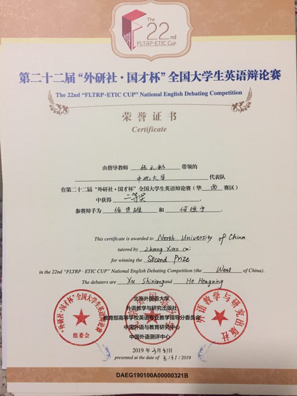 2019年3月30日至31日,“外研社·国才杯”全国大学生英语辩论华西赛区总决赛于四川师范大学圆满完成,我校派出由张小彩老师指导的,人文社会科学学院英语专业大二学生徐世雄、何恒宁所组成的参赛队伍。在经过为期两天的角逐后,中北代表队力克群雄,在八十多所参赛高校中脱颖而出,获得华西赛区总决赛二等奖。此前,为选拔出精英队伍,我校人文社会科学学院特举办全校范围的校选赛,并邀请外研社英文思辨教育功勋培训师郝晓威老师开展针对英国议会制英语辩论的赛前培训会,获得各学院学生的青睐。此次活动共计有六十多支队伍报名参赛,分为初赛、复赛和决赛三个阶段,最终有四支队伍进入校选赛决赛,并且所有的参赛选手都将获得有外研社认证的校选赛证书及赠书,而我校人文社会科学学院也因在组织校选赛活动中的突出表现,被授予由外研社国才杯组委会颁发的优秀组织奖。这是我校第一次参与到这项国内创办最早、规模最大的的全国性英语辩论赛事当中,也是我们取得的一个傲人的成绩,象征着我院英语教学的硕果、同时也标志着我校英语思辨教育的成功启航。