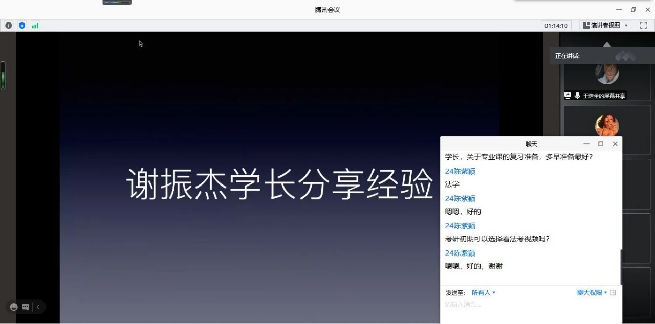 三位校友分享了他们自身总结经验。广播电视学优秀毕业生雷丹学姐指出英语方面的学习可以借鉴网课刘晓燕老师,真题网课换自己的模板,且着重指出记单词是一个长期的过程。准备前期重心放在英语后期放在政治。精准描述了学硕与专硕的区别:学硕三年(研究,学者学术,深造)理论性考试多一些,而专硕的实践多一些,工作专业性考试多一些;法学专业优秀毕业生谢振杰学长谈到他的初试复试的经历,主要讲到了关于复试的态度方面的问题,指出复试可以放松,但不能过于放松,态度端正,正确对待调剂,认真考虑调剂学校。在准备时间方面指出要看专业,尽早准备;英语专业优秀毕业生牛文佳学姐指出考研什么时候准备都不晚,应规划自己想选的城市类型,调整的心态,应将学习快乐化、对学习有规划,劳逸结合。三四轮专业课复习,细学,再细学,可以背知识点。日积月累记单词、刷真题、锁定目标,要喜欢自己的专业,择校择专业。就业方面告诫我们要利用应届生给自己铺后路。有自己的想法,可以进行职业性格测试、语言能力加试,关注学校招就处获得就业信息来为自己积累机会。