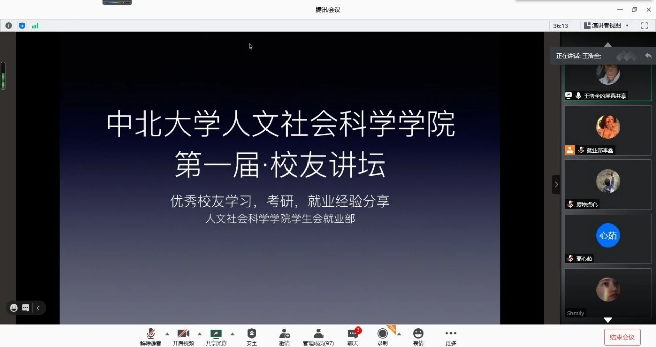 10月10日晚,中北大学人文社会科学学院举办第一届• “校友讲坛暨优秀毕业校友考研就业学习经验分享交流会”。会上校友真诚谨慎地讲述了各自的经验及教训,给予我们精神上的滋养以及实践上的指导。