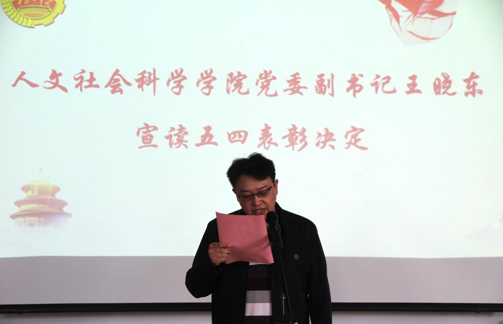 院党委副书记王晓东宣读了《人文社会科学学院2020年度团内先进集体和优秀个人表彰决定》。学院第二团总支荣获先进团总支荣誉称号;18100141团支部荣获五四红旗团支部荣誉称号;18100142、19100242、20100341、20100342团支部荣获先进团支部荣誉称号;张砚希等3人荣获优秀团干标兵荣誉称号;韩光焱等4人荣获优秀团员标兵荣誉称号;于书岑等13人荣获优秀团干荣誉称号;兰姗等29人荣获优秀团员荣誉称号。
