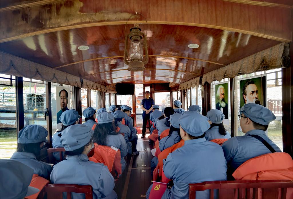 校党委副书记薛智首先在“红船”上为教师党员讲授党史党课,让全体党员深刻体验党的一大召开的神圣历史时刻和伟大的红船精神。他回顾了我党的光辉历史、初心使命、伟大精神、伟大贡献和宝贵经验,要求全体党员要坚定理想信念、继承革命传统,用百折不挠的精神投身立德树人根本任务,为我校双一流建设贡献人文力量。