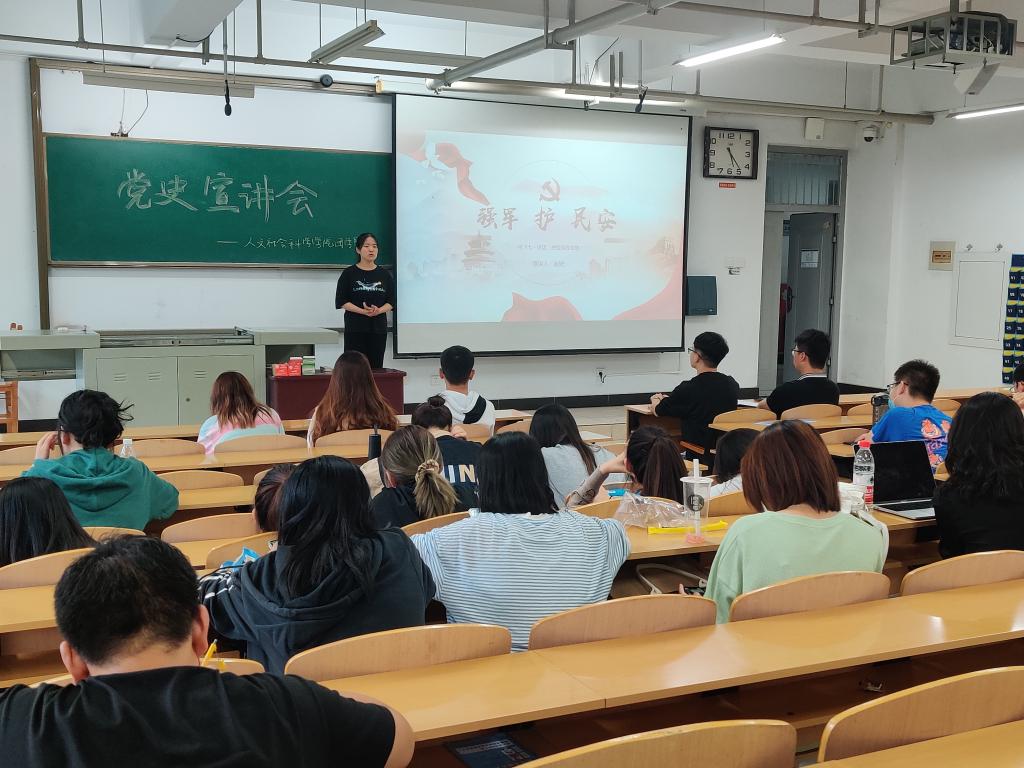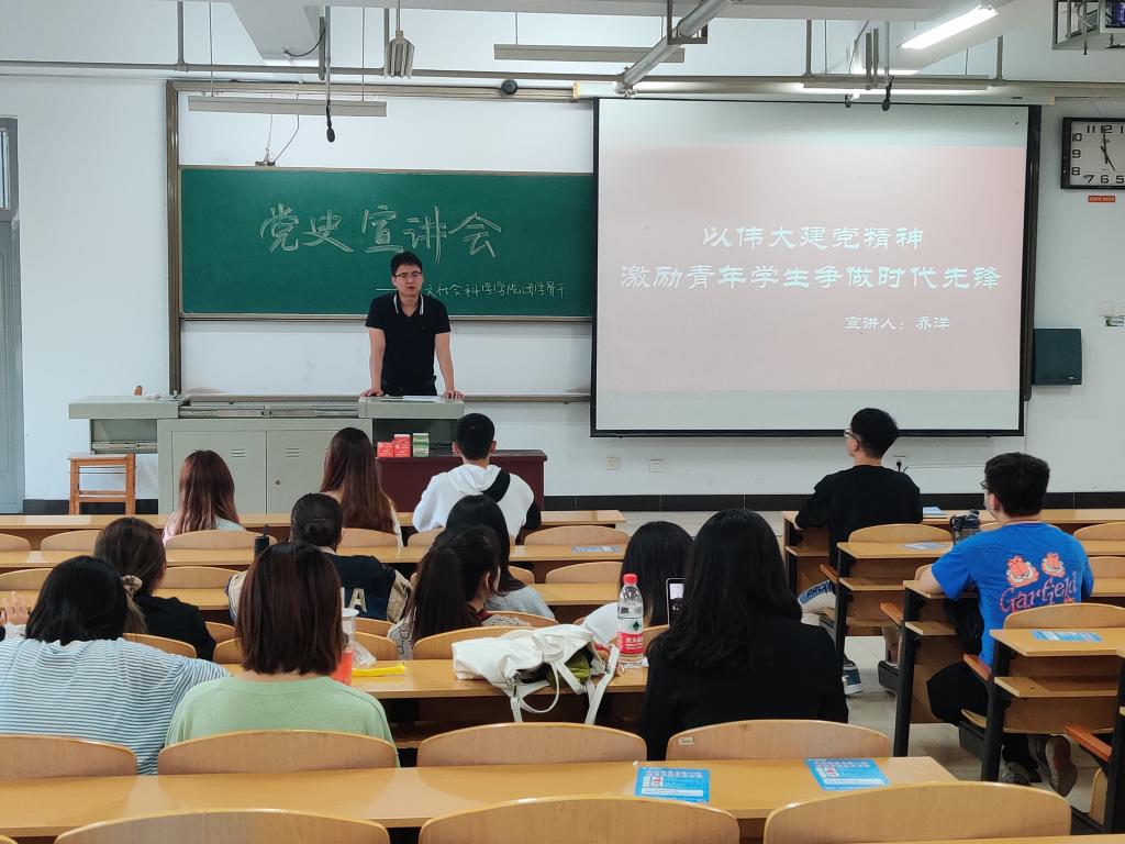 乔洋老师做题为“以伟大建党精神激励青年学子争做时代先锋”宣讲,他号召学院青年学子要深刻学习领悟伟大建党精神,坚守理想、担当使命、不懈奋斗、爱党爱国,争做时代先锋;张梦溪同学通过一段短片让大家更直观的理解了四个阶段、民族精神、两个百年目标等一系列知识;崔娆同学则以“强军护民安”为主讲内容,向同学们讲述了军队建设的重要性以及中华民族的强军目标。