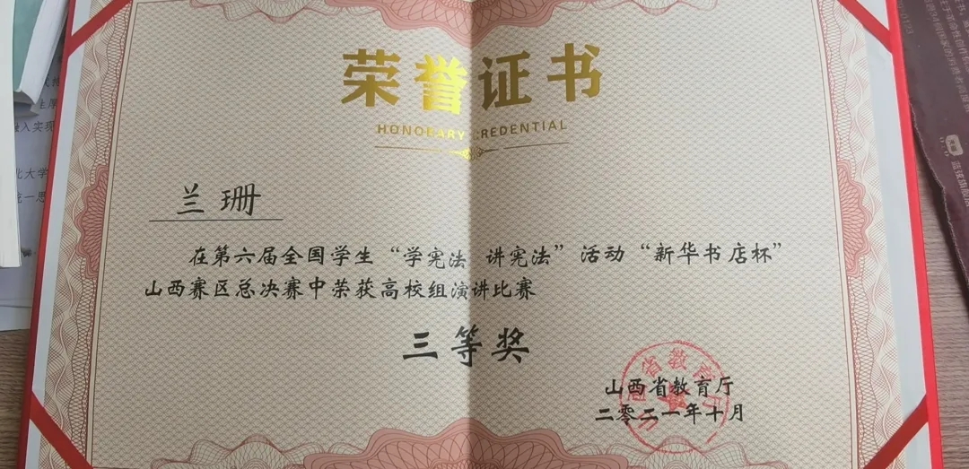 星光不负赶路人,时光不负有心人。台上一分钟,台下十年功。兰珊同学在第六届全国学生“学宪法讲宪法”演讲比赛山西赛区高校组总决赛中脱颖而出,是我校充分贯彻落实法制宣传工作的重要体现,同时彰显了人文社会科学学院浓厚的文化底蕴。相信我校学子定能以本次比赛为契机,自觉成为宪法的忠实崇尚者、自觉遵守者、坚定捍卫者。