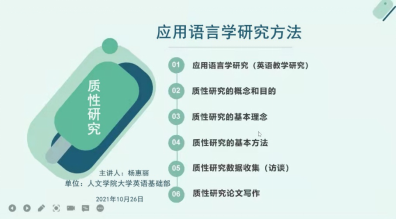 首先,杨惠丽老师就U讲堂中由北京外国语大学徐浩副教授担纲主讲的《应用语言学研究方法:质性研究》课程,从质性研究的概念与目的、基本理念与方法,访谈原则与方法、质性研究论文的写作等方面,进行了详细的梳理。之后,老师们对该研究方法进行了深入的探讨。 陈欣如老师从质性研究中资料收集的路径与分析方法方面进行了更深层次的解释并推荐了与该方法相关的U讲堂其余课程,让老师们参考、借鉴。卫春艳老师着重对质性研究中个案研究的历史渊源、特点、类别以及适合解决的问题等进行了细致的解读。最后,马淑丽老师对本次线上活动进行了总结,希望老师们以此为契机,会后进行线下的后续交流、讨论,夯实科研基础知识,通过科研提升大学英语教学实践水平。