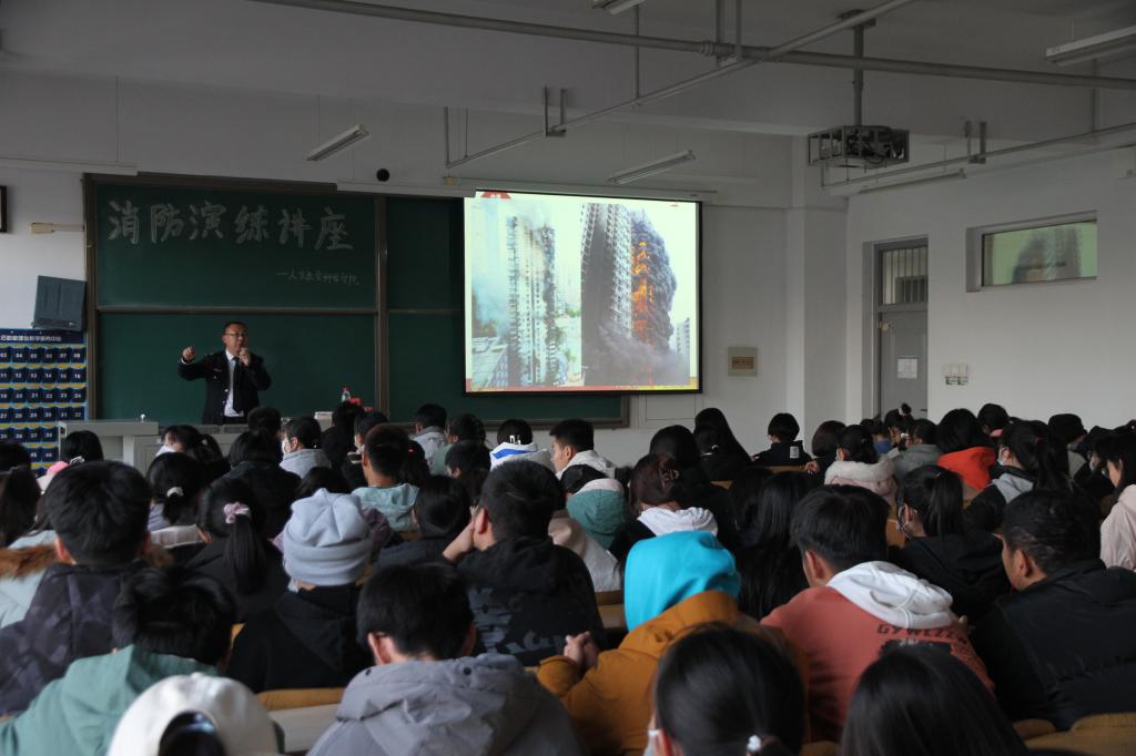 消防演练过后,学院组织同学们参加了消防安全讲座。讲座中,刘教官详细地介绍了火灾逃生知识,并通过实际案例向大家分析了缺乏消防意识和消防知识的危害,一张张现场照片向大家直观的展示了火灾现场的惨状,使同学们更加重视对火灾的预防。