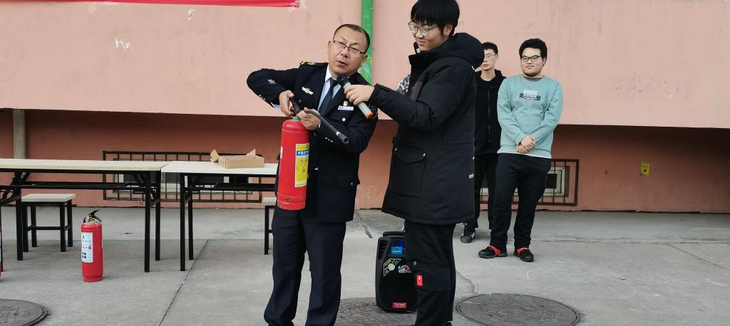 哨声响起,同学们有序而又迅速地离开宿舍楼,在规定时间内全部抵达空旷场地,并在两分钟内快速集合后,各班进行人数清点。本次活动我们邀请到了刘根旺教官进行消防知识讲解。刘教官认真为大家讲解了有关火灾现场的应急处置方案、灭火器的使用原理以及相关的注意事项,并亲自演示了灭火器的使用方法。随后,同学们在刘教官的指导下积极动手实践。