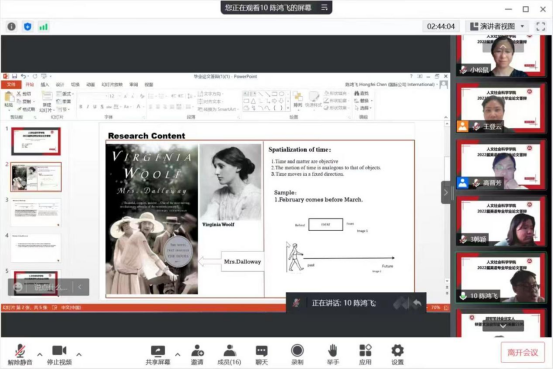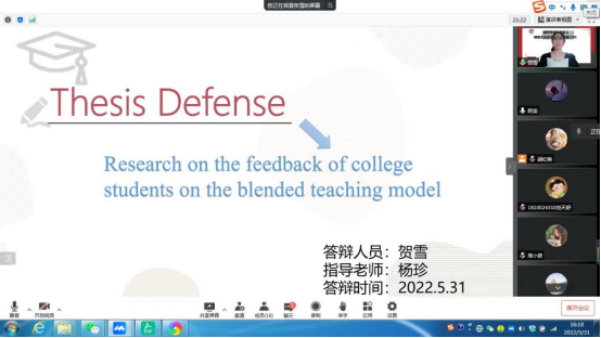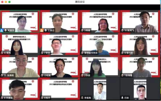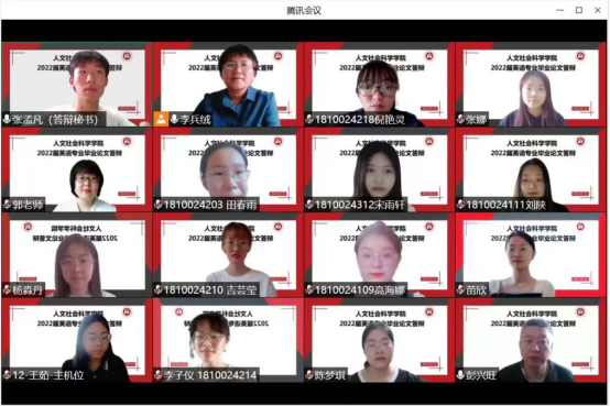 5月31日下午,人文社会科学学院英语专业组织开展了2022届本科毕业生学位论文答辩工作。所有73名毕业生分为六组在线上进行了答辩,整个过程组织规范、严谨有序,最终圆满完成。