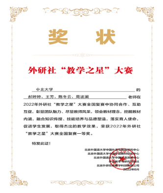 在2022年外研社“教学之星”大赛(本科英语组)全国复赛中,我院教师郝婷婷、王芳、陈冬云、周波澜老师组成的团队获得全国复赛一等奖。
