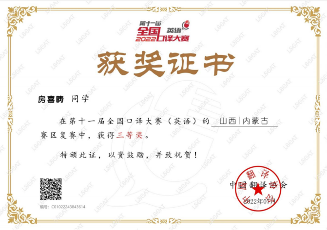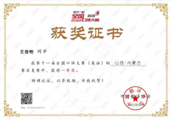 近期,我院学子英语专业王佳怡、韩梦捷、房喜畴三位同学在第十一届全国口译大赛(英语)山西赛区复赛中分别荣获一等奖和三等奖的好成绩。