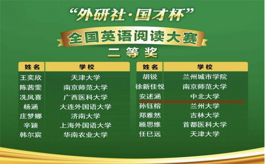 从省赛到国赛,得到了校院两级的大力支持,学院竞赛团队认真筹备、组织,指导教师精心指导,参赛学生认真备赛,师生共同努力,最终在全国决赛中取得了骄人的成绩:2020级英语专业本科生白亮在全国183名参赛选手中脱颖而出、顺利进入全国88强,以标准的发音、敏捷的思维、稳健的台风,最终荣获2022“外研社 ·国才杯”英语演讲全国二等奖;2019级英语专业本科生安述涵以山西省第一名的成绩晋级2022“外研社 ·国才杯”英语阅读全国决赛,充分发挥自己的知识广度、人文积淀,展现了自己的信息获取、分析和提炼整合综合能力,一举获得国家级二等奖。2020级英语专业本科生陈洁凭借独特的创意构思和逻辑归纳、辩证思考及解决问题的能力,最终摘得国家级三等奖。