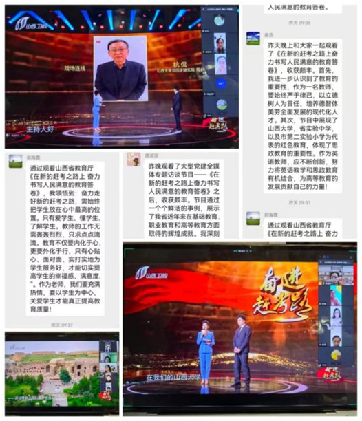本次《奋进赶考路》节目讲述了我省基础教育,职业教育和高等教育的发展和进步。并且提到了我校多项科研成果助力中国航天事业的可喜成绩。大家在感到自豪同时也感到了肩上的责任与担当。作为教育工作者,应深入学习并宣传党的二十大精神,全面学习贯彻党的教育方针,落实立德树人的根本任务,立足本职,学习、研究、继承和发展陶行知教育思想,坚定对教育之爱、践行“教学做合一”、躬身与生同发展,做好学生的“引路人”“领路人”和“筑梦人”,用最饱满的热情做好本质工作,用新思想武装头脑、用新理念指导实践、用新劲头推动教改、用新担当践行一名共产党人的教育初心和使命。