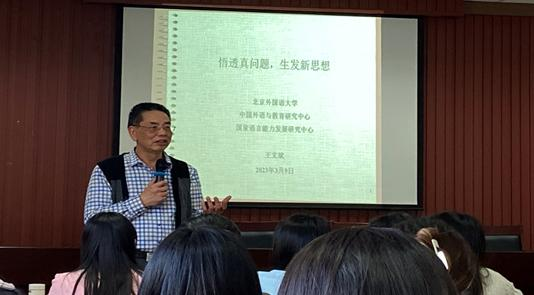 3月9日下午,北京外国语大学博士生导师、教育部高等学校英语专业教学指导分委员会副主任委员王文斌教授受邀为我院师生做了题为“悟透真问题,生发新思想”的学术报告,学院外语教师和部分研究生、本科生参加。报告会由芮燕萍院长主持。