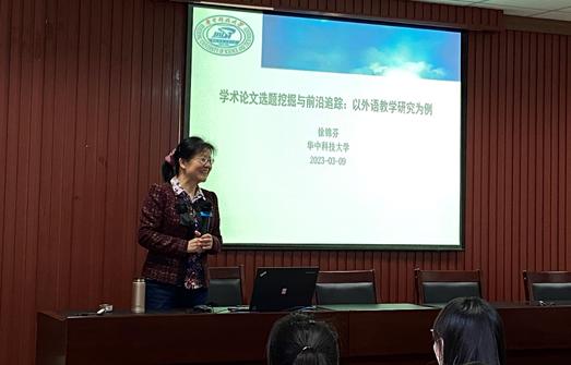 3月9日,华中科技大学博士生导师徐锦芬教授应邀在我院报告厅作了题为“学术论文选题挖掘与前沿追踪:以外语教学研究为例”的学术讲座。外语系全体教师和在校研究生参会聆听。讲座由人文社会科学学院院长芮燕萍教授主持。