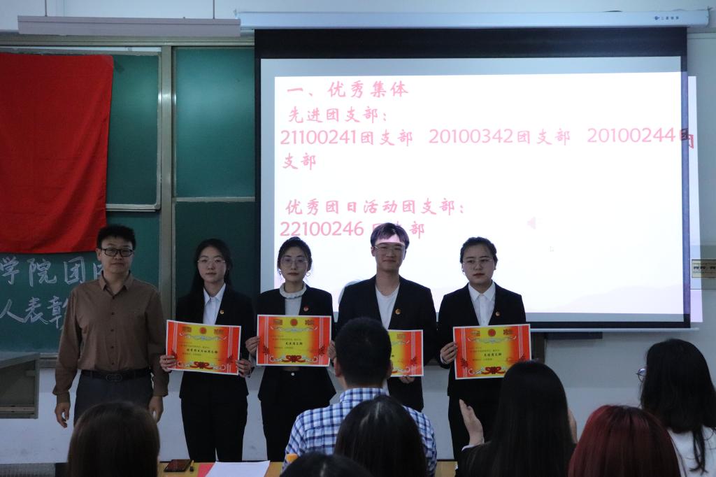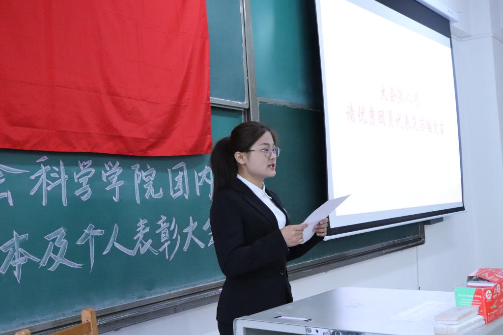 颁奖结束后由优秀团干代表杨玮彬和优秀团员代表范苏瑶进行发言。他们表示今后将继续总结成功的经验和失败的教训,弥补不足,精益求精。同时他们也表达了对学校、学院和老师们的感激之情,未来将不负所期,努力学习,积极进取,为学校,为社会,为国家贡献青年力量。