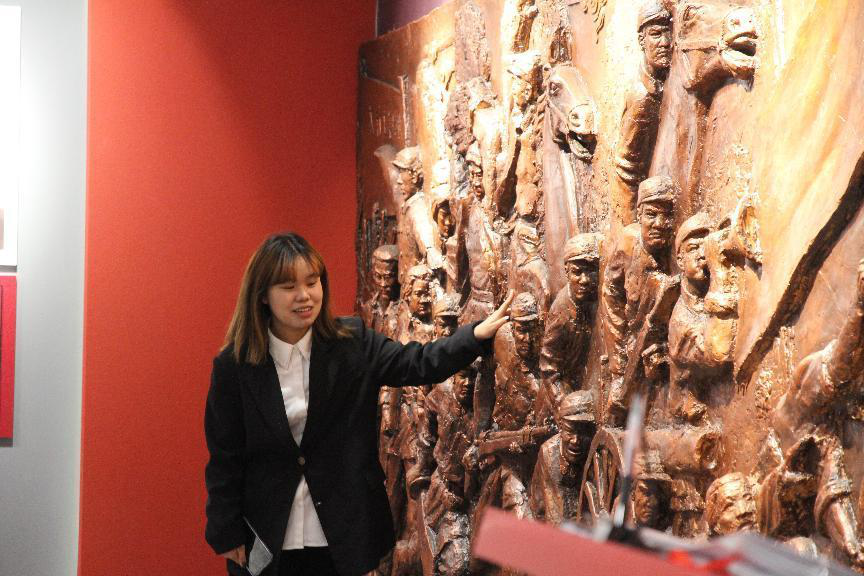 进入校史馆,同学们在讲解员李欣怡的带领下,观看了一张张充满历史感的照片,深刻了解了学校从“太行工业学校”几经更名到中北大学的发展历程,理解了“人民兵工第一校”的历史来历。其中在一面暗色调的浮雕上,讲述了中北大学诞生的时代,战争肆虐,彭德怀将军和一群冲锋在前的战士们坚定不移地守护着五星红旗不倒,展现了中北大学的建校历史,同时也是中国人民的抗战史的缩影。