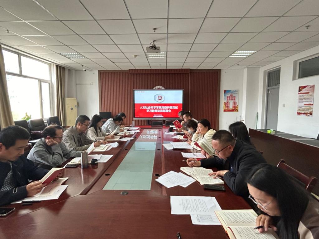 4月24日上午,人文社会科学学院党委开展党纪学习教育动员部署暨学院党委理论学习中心组(扩大)党纪学习教育读书班第一次集中学习会。会议由院党委书记孙俊伟同志主持,全体院领导、学院党委委员、党支部书记及科室负责人参加了会议。