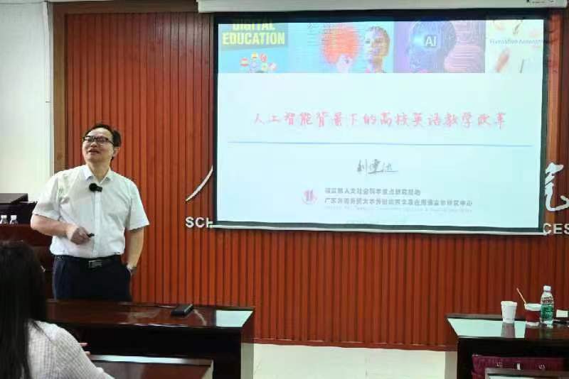 2024年4月26日,广东外语外贸大学副校长、博士生导师刘建达教授以《人工智能背景下高校英语教学改革》为题,就大学英语教学的现状以及大学英语教学面临的人工智能新生态进行了学术讲座,人文社会科学学院全体外语教师和硕士研究生参会聆听,院长芮燕萍教授主持。