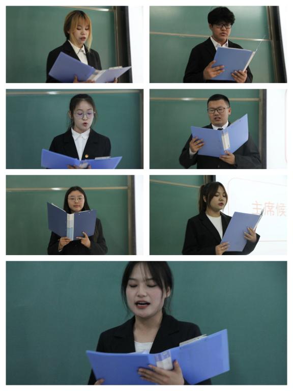 大会第九项,主席候选人分别做自我陈述。学生会主席候选人分别是范玥、韩利娜、李欣怡、李道博、刘庆宵、马洁和尹玉。研究生会主席候选人分别是景淏桐、李想和任玲娜。