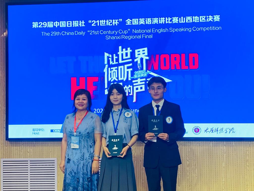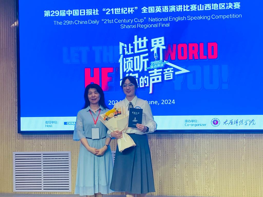 2024年6月16日,第29届中国日报社“21世纪杯”全国大学生英语演讲比赛山西省决赛在太原师范学院落下帷幕。来自我校、太原理工大学、山西财经大学等山西高校的诸位选手强强相遇,展开对决。最终,来自人文社会科学学院英语专业的张蔼添和梁墨怡两位同学发挥出色,脱颖而出,分别获得山西省冠军和山西省一等奖的好成绩,并将代表山西省参加全国半决赛。