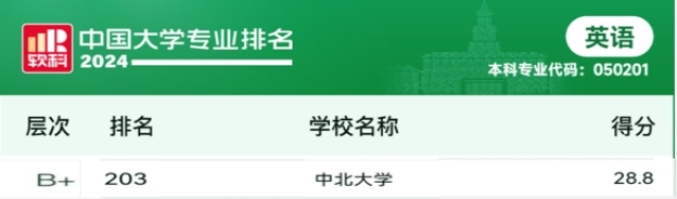 2024年6月13日,高等教育专业评价机构软科今日正式发布“2024软科中国大学专业排名”,在全国开设英语专业的984所高校中,我院英语专业近几年排名持续攀升,排名203,与山西大学、太原理工大学同位于B+之列。