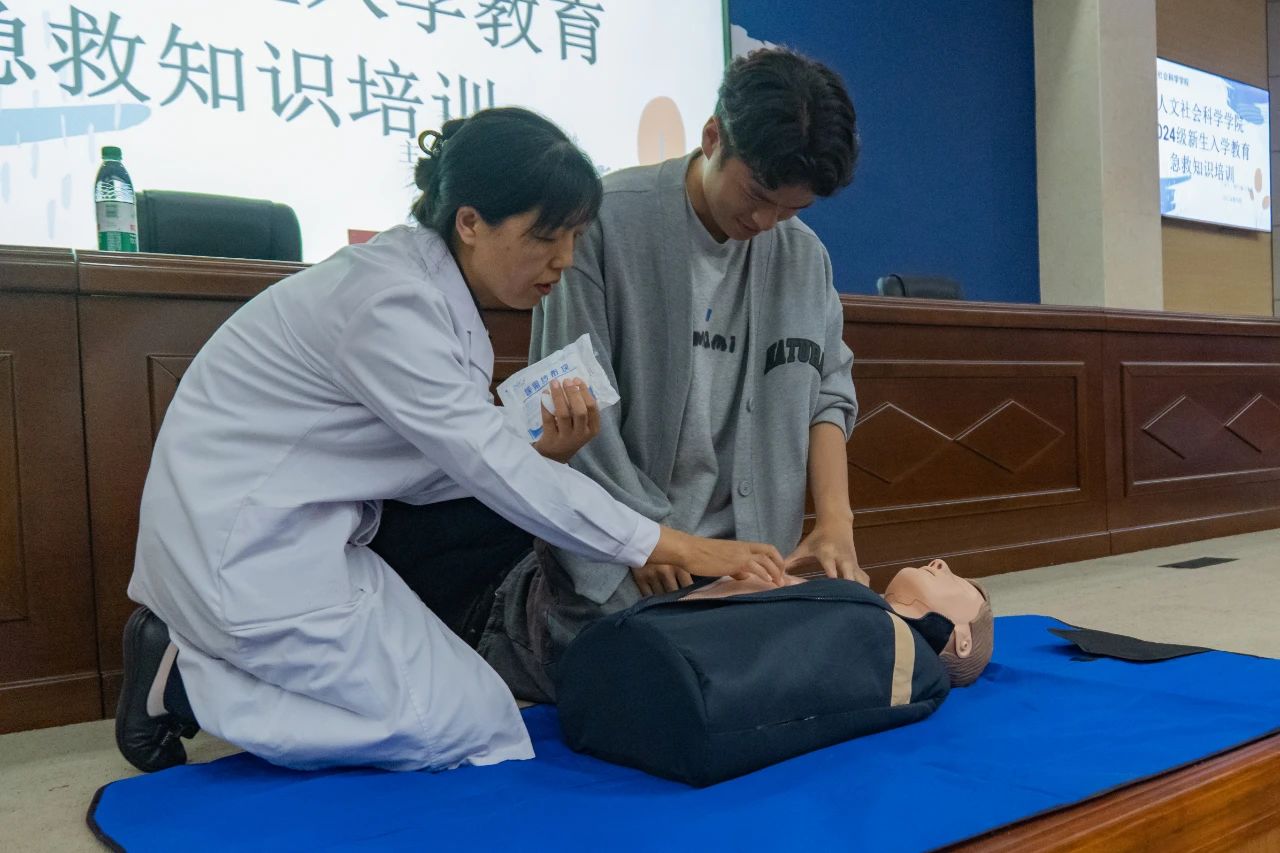 大一新生入学教育不仅关乎学生个体的发展,也关乎整个高等教育的质量。为了帮助新生适应新的学习生活环境,树立正确的价值观和人生观,9月26日下午两点半人文社会科学学院在瑾瑜国际中心举办了人文社会科学学院2024级开学第一课“急救培训”活动。