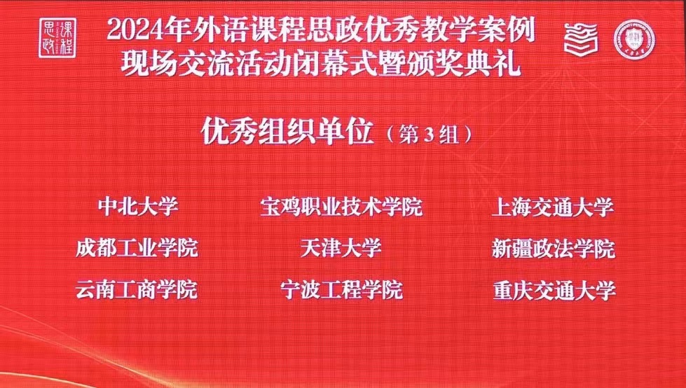 11月17日,“2024年高等学校外语课程思政优秀教学案例现场交流活动”在天津落下帷幕。人文社会科学学院大学英语基础部教师李美英、马淑丽、张宏涛、张英组成的教师团队荣获大学英语本科组国赛一等奖,中北大学荣获“优秀组织奖”。
