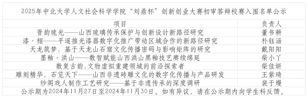 最终,有七组选手脱颖而出,成功进入校赛的舞台。公示名单如下(项目及负责人信息截取自中北大学 2025 年“刘鼎杯 ”大学生创新创业大赛人文社会科学学院初赛创业类项目名单 ):