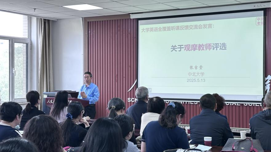 自2月24日至4月3日,校督导委员会采用线上线下相结合的方式,对大学英语课程开展了两轮全面、深入的全覆盖听课。会议伊始,校督导委员会主任委员张吉堂详细阐释了此次全覆盖听课的目的,并解读了《中北大学本科教学督导委员会观摩教师评选办法》。紧接着,校督导委员会副主任委员尹四清反馈了大学英语课的听课情况,结合两轮综合分统计数据,对大学英语教学给予了深度点评:教学思路清晰,层次分明;教学手段多元,形式灵活;课堂管理有序,氛围良好;思政元素融入自然,兼顾素养养成。同时也指出教学中存在的如PPT与板书利用欠佳、互动形式单一等问题,并提出切实可行的改进建议。