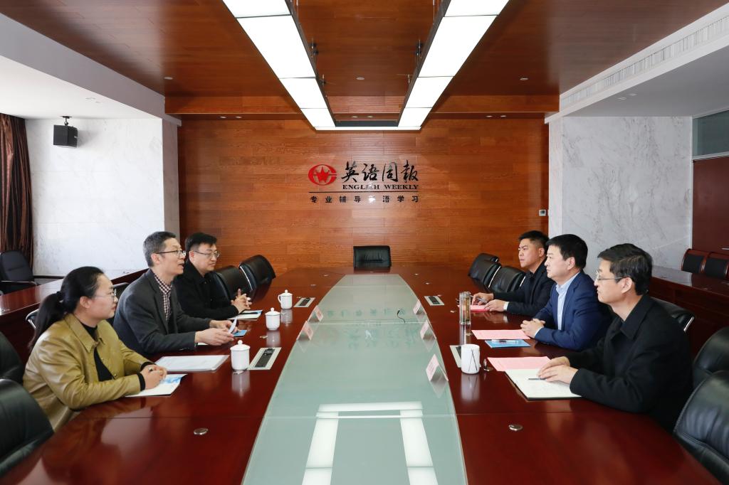 院党委书记孙俊伟、副书记王晓东、学生第二党支部书记赵竞一行参观了英语周报社展厅,了解报社的创办发展历程、企业文化、运营等情况。随后,英语周报社社长徐文伟、总编辑刘永俊、办公室主任郝毅与学院一行共同参加了校企合作座谈会。学院党委书记孙俊伟从办学历史、师资力量、办学特色、学术研究成果等方面介绍了学院基本情况;党委副书记王晓东介绍了学院专业未来前景、就业方向、学生工作特色。英语周报社社长徐文伟对人文社会科学学院办学特色与成绩表示高度认同,介绍了报社的运营、特色品牌、人才需求等基本情况;总编辑刘永俊介绍了英语周报的内容把控、人员选拔与培训等情况。双方初步达成校企合作的意向,并就具体合作方式与内容做进一步商讨。