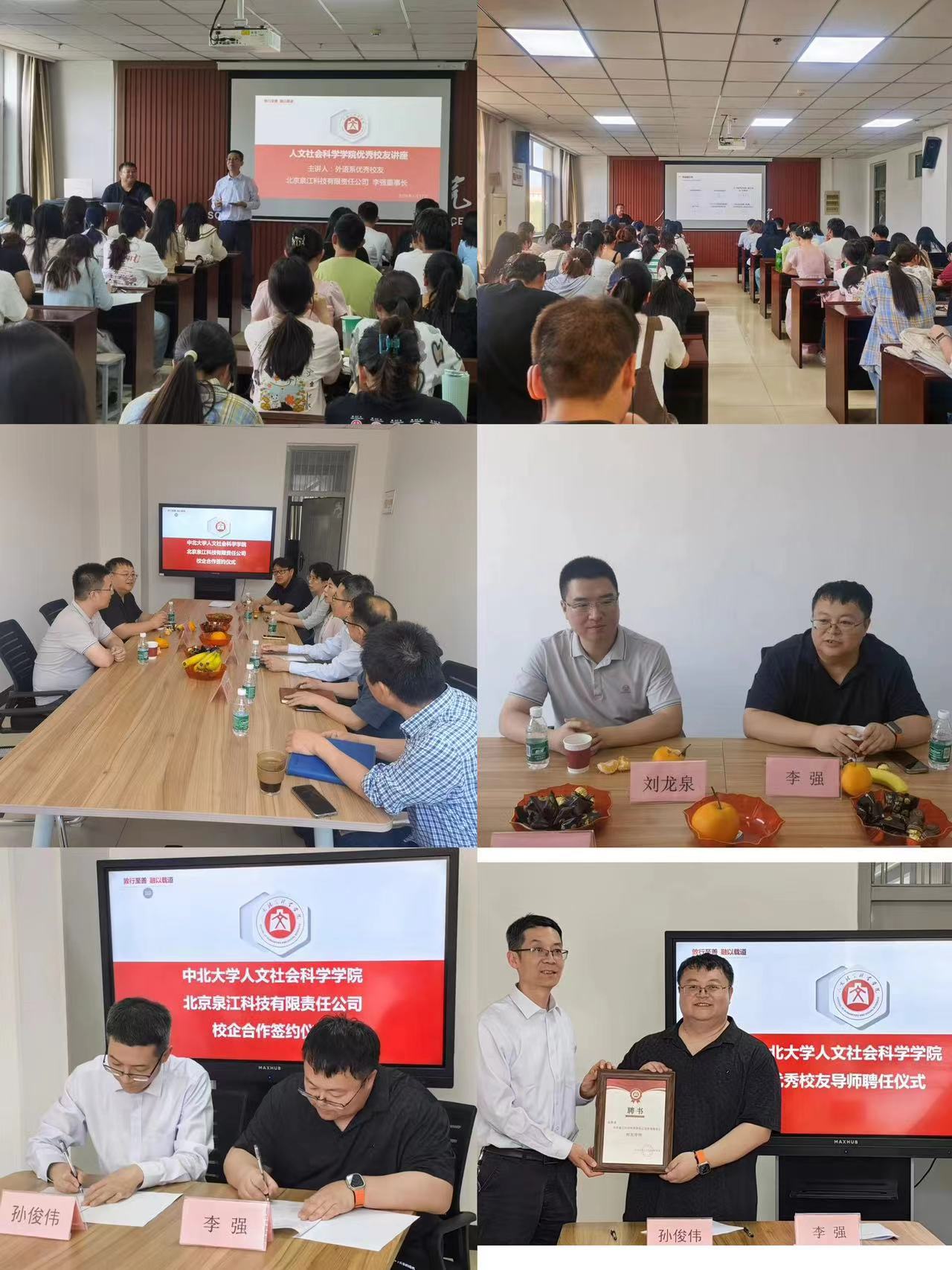 讲座前,李强校友、北京泉江科技有限责任公司太原分公司总经理刘龙泉一行参加了学院组织的优秀校友座谈会,学院党政领导班子和李强校友一行就加强人才供需、教学科研、专业实习、创业实践等方面的持续深入合作展开热烈讨论交流。人文社会科学学院党委书记孙俊伟代表学院与李强董事长签订校企合作协议,并向李强颁发“优秀校友导师”聘书。