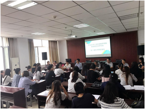 在英语语言文学专业导师见面会的开始,人文社会科学学院院长芮燕萍教授做了开场讲话。芮院长对2017级新同学的到来表示热烈欢迎,着重对英语语言文学专业的学科概况和毕业要求做了详细介绍,同时表达了对同学们的殷切期望,希望同学们能够刻苦学习、努力钻研,取得长足的进步。与此同时,思想政治教育专业的导师见面会也在进行中,副院长杜鹃老师对研一新生再次表示了热烈的欢迎。紧接着各专业的硕士生导师依次对自己的学习经历和研究方向进行了详细的介绍。同学们都仔细聆听,认真做笔记。在导师介绍完之后,研一新生分别有序的介绍了自己的基本情况和自己感兴趣的研究方向。最后进行了导师和同学们的互动环节,同学们分别和自己感兴趣的导师进行了更深度的交流。