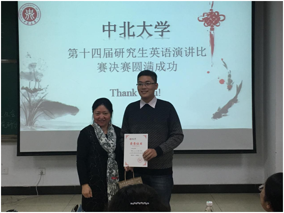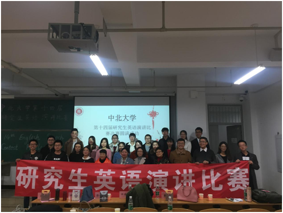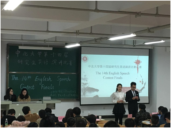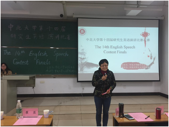 2017年11月12日上午9时,中北大学第十四届研究生英语演讲比赛决赛在15号楼106H教室顺利举行。此次比赛由中北大学研究生会主办,人文社会科学学院研分会承办。出席嘉宾是人文社会科学学院研究生辅导员刘莉莉老师、研究生院教育管理科殷勍老师、任伟吉老师及研究生会主席刘昕。由人文社会科学学院英语教研组马淑丽、刘陈艳、崔秀珍、张小彩和高晋芳五位老师担任决赛评委。