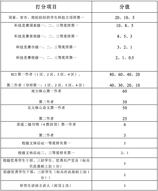 6、荣誉分:申请前获得优秀学生干部(标兵)、三好学生(标兵)、校级优秀共产党员称号。研究生学术讲座主讲人加分限两次。