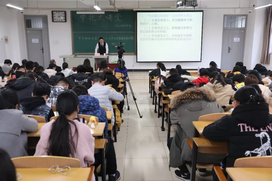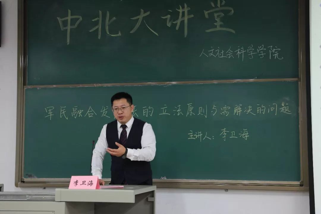 2018年11月24日下午,由人文社会科学学院承办的我校第112期中北大讲堂在15102H教室成功举办。中国政法大学军事法研究所所长、军民融合法治研究院院长李卫海教授受邀担任主讲人,他以《军民融合发展法的立法原则与需解决的问题》为题,给师生们带来一场精彩报告,助力我省军民融合法制研究会的发展。我省法学会军民融合法治研究会会长药恩情教授主持本次讲堂,常务副会长岳文婷、秘书长王改琴、副秘书长张玮麟、刘瑞强博士及学生科孙梦瑶老师出席本次活动,我校全体法学生参加本次讲堂。