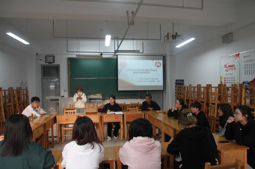 9月28日下午,中北大学“石榴花开”民族团结进步教育辅导员工作室组织工作室成员和人文社会科学学院全体少数民族同学认真学习习总书记在中央民族工作会议上的重要讲话精神。同时,为了增强少数民族学生教育管理工作的针对性与实效性,工作室按照少数民族学生的区域分布性特点,分别组织了四场少数民族学生座谈会。学生处申合娟与工作室加俊、阿迪力三位老师主持西北地区少数民族学生座谈会,工作室李娜、王盼两位老师主持西南地区少数民族学生座谈会,工作室赵竞、孟伟两位老师主持华南地区少数民族学生座谈会,工作室乔洋、周甜甜两位老师主持东北及内蒙古自治区少数民族学生座谈会。