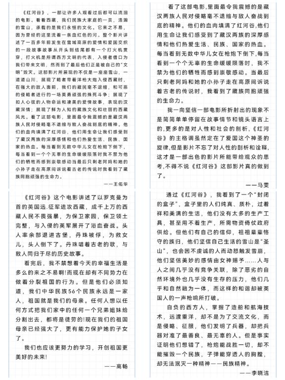《红河谷》拍摄于1996年,以20世纪初的西藏为背景,反映了1904年英国侵藏战争中江孜战役等历史真实事件,演绎了一段汉藏儿女生死相依的爱情故事和并肩抗战的英雄传奇。影片是一首由强烈的爱国主义思想凝成的浑厚而热烈的生命的礼赞,通过扣人心弦的人物命运和凄美的故事,表现汉族和藏族人民之间的浓厚的深情厚谊,展示藏族人鲜为人知的勇敢无畏的品质,赞颂了中华民族儿女的爱国主义精神。影片带给观影同学们深深的感动与震撼。
