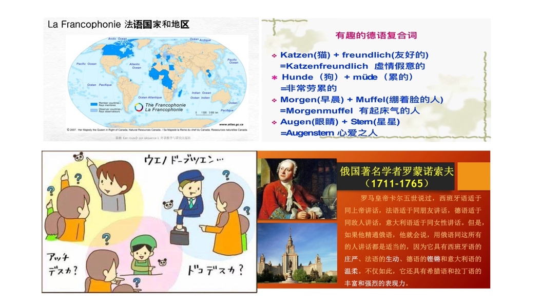 德语教师李霞从德语的特点以及德语作为二外的优势和劣势等三方面展开线上宣讲活动,引导学生了解二外德语的学习;法语刘晓华老师介绍了法语课程和法语文化两部分。刘老师通过2024年央视春晚中法歌唱家合唱的《巴黎圣母院》歌剧选段向学生们展示了法语之美以及中法建交60周年的一系列活动,指出在学习法语知识的同时会邂逅文化。日语教师秦冠男介绍了二外日语课程,在对教材展开推介的基础上,进一步向同学们介绍了在教学活动的语言语法知识使用、人文知识学习和跨文化能力的培养等环节;俄语教师李葆华从中俄睦邻友好、俄语谱系分类和二外俄语课程三个方面展开了宣讲,指出学习俄语在当下大有可为,鼓励同学们积极选报。