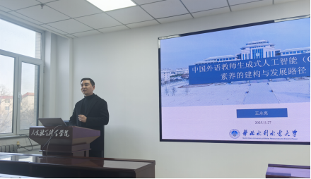 11月27日下午,我院特邀2022-2024年连续三年入选爱思唯尔(Elsevier)外国语言文学“中国高被引学者”榜单,2024-2025年连续两年入选美国斯坦福大学发布的“全球前2%顶尖科学家影响力榜单”(语言学领域)的王永亮老师,以“中国外语教师生成式人工智能(GenAI素养的建构与发展路径”为题开展学术讲座。院长芮燕萍教授主持讲座,部分教师骨干、英语语言文学专业硕士研究生及兄弟院校外语教育工作者参与交流。