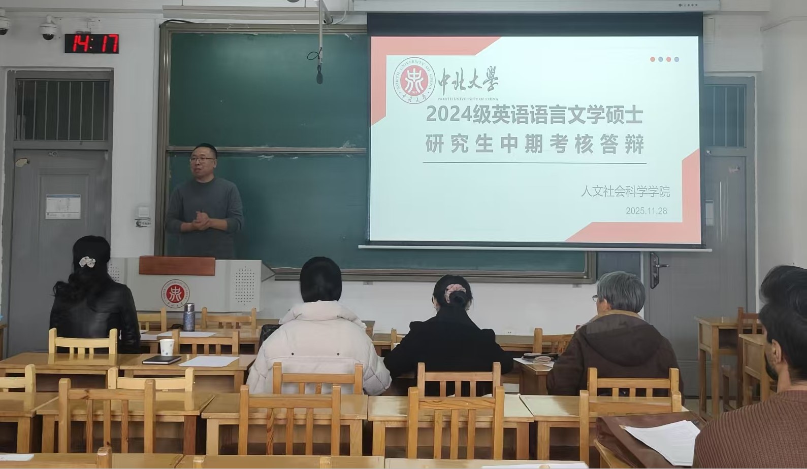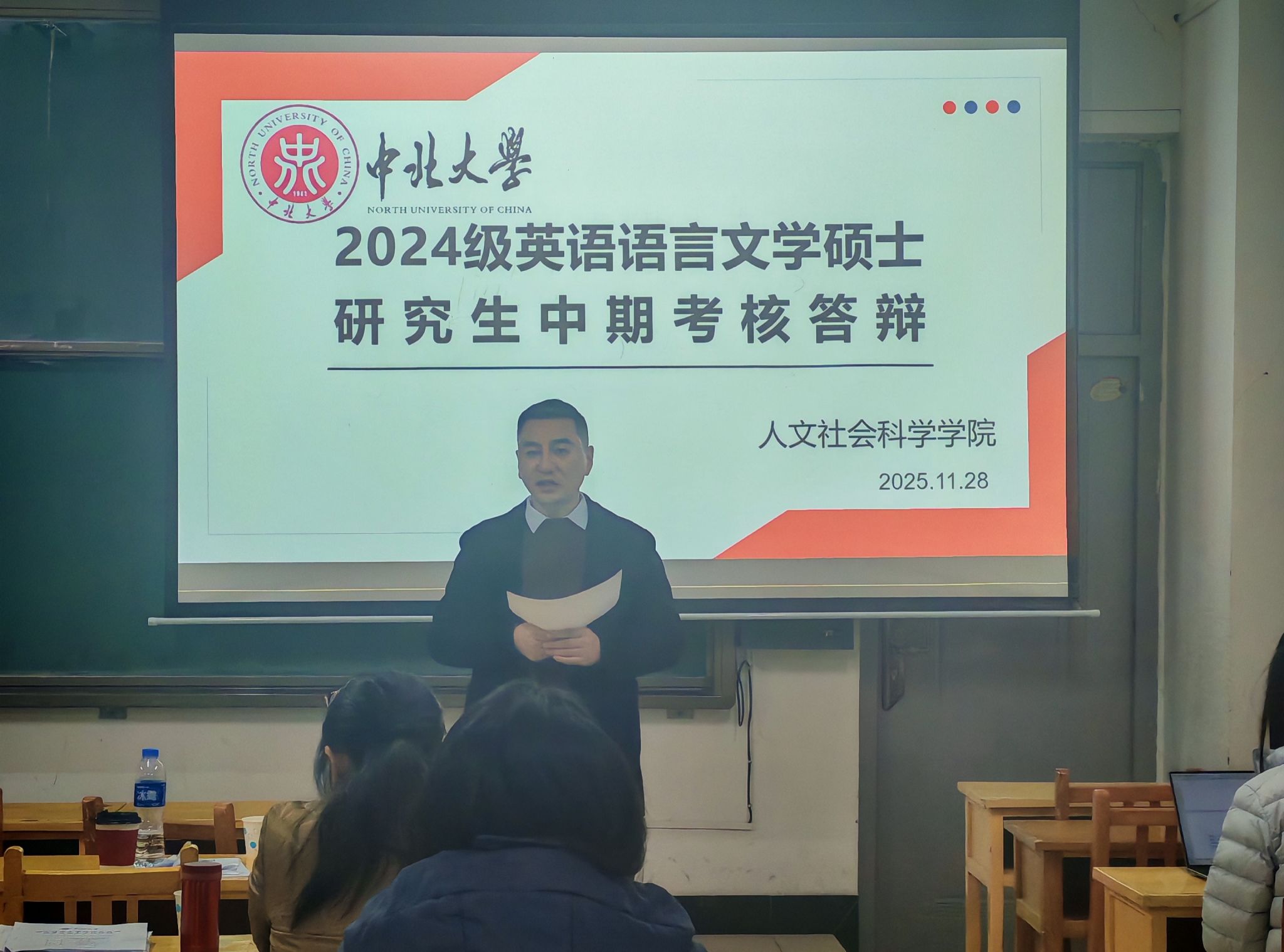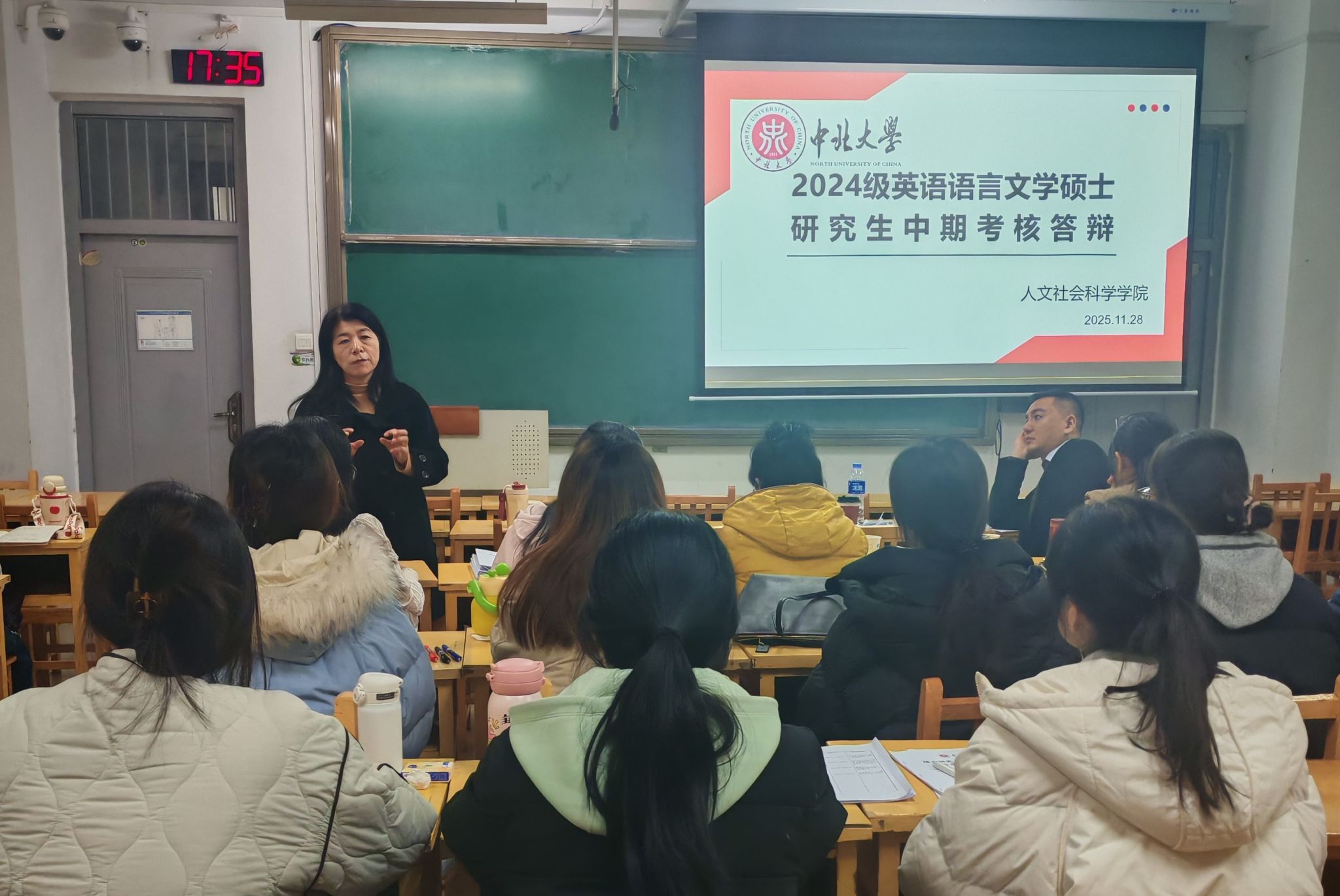 按照《中北大学关于硕士研究生中期考核的暂行规定》要求,2025年11月28日下午,我院举行了2024级硕士研究生中期考核答辩会。本次考核答辩分两个组,分别邀请到华北水利水电大学王永亮副教授和山西大学冯薇教授担任评审组组长,由院长芮燕萍教授和赵国锋副教授主持,2025级全体硕士研究生全程观摩学习。我院英语语言文学专业研究生导师及2024级全体硕士研究生参会。