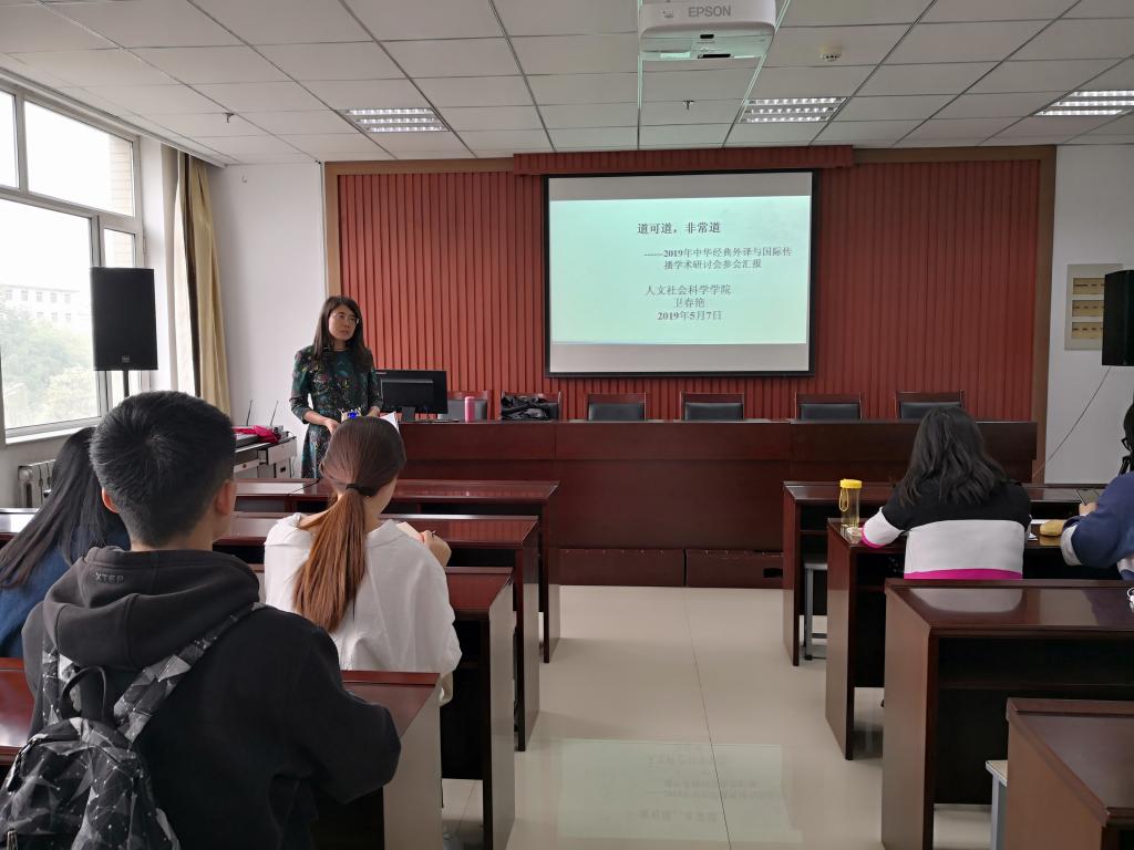 2019年5月7日下午4:30,人文社科学院教师卫春艳在本学院502报告厅做学术报告,题目为“道可道,非常道——2019年中华经典外译与国际传播学术研讨会参会汇报”。